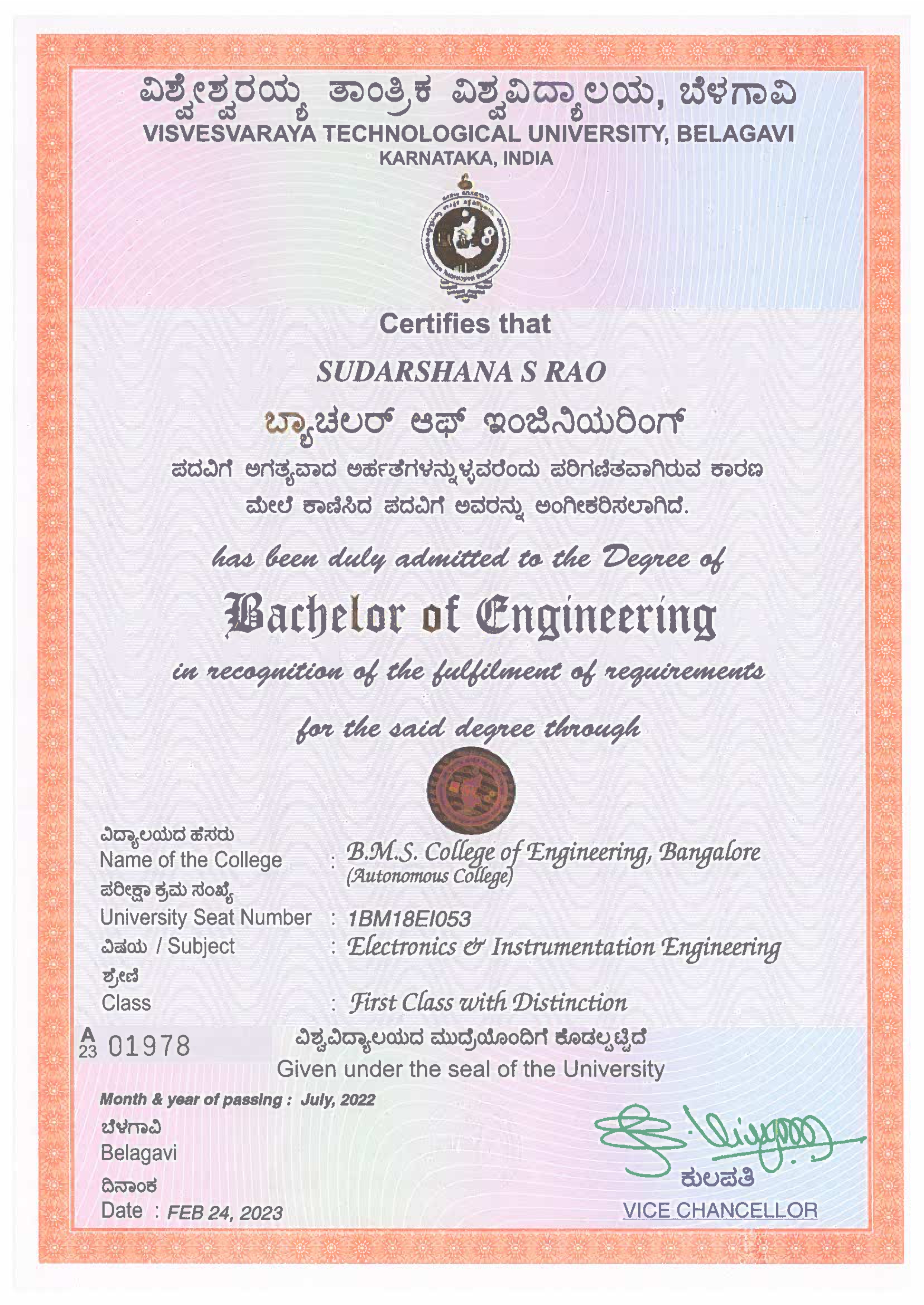 - Bachelor of Engineering (B.E.) in Electronics and Instrumentation Engineering, B.M.S. College of Engineering (BMSCE) 2022