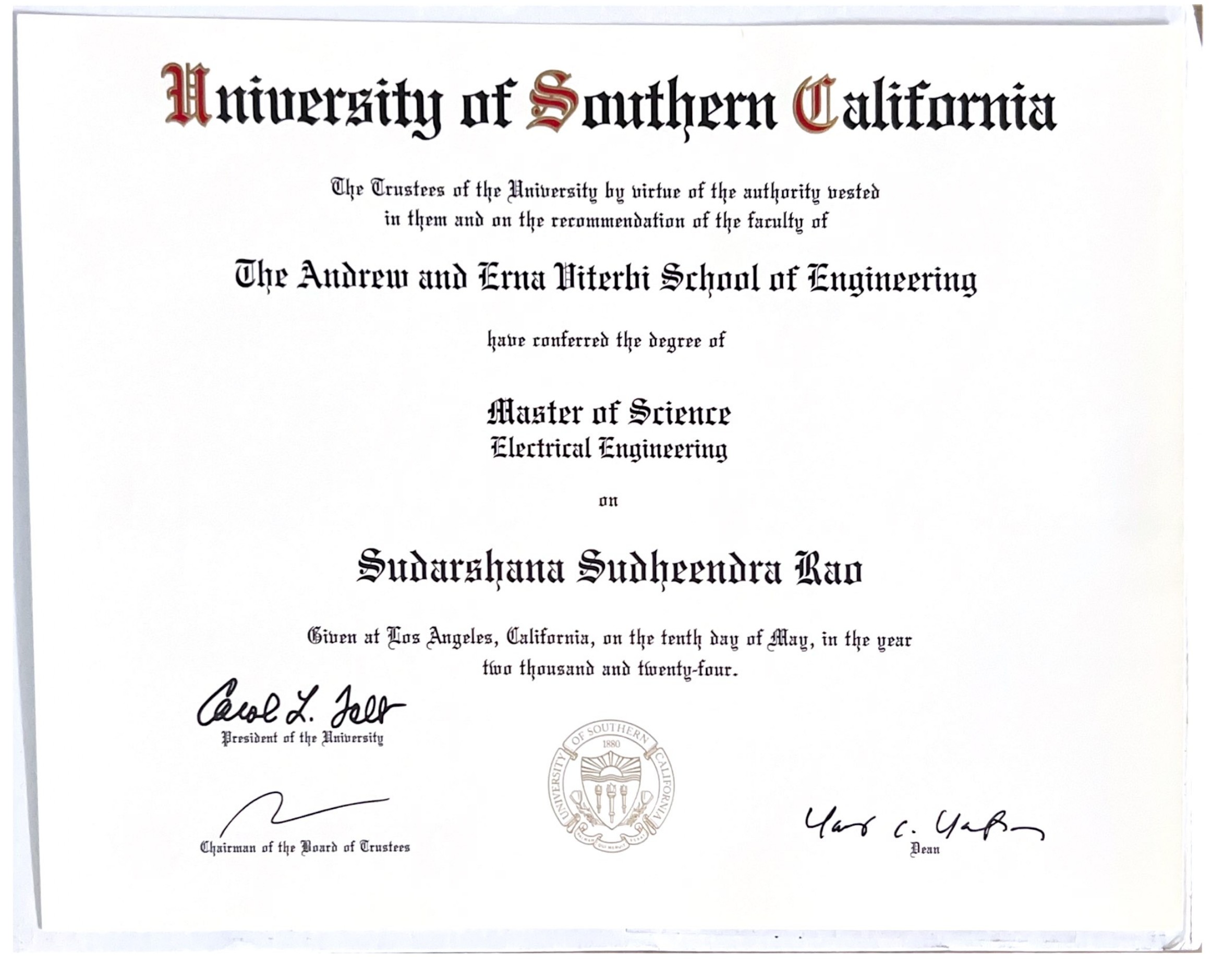 - Master of Science (MS) in Electrical Engineering (Machine Learning & Data Science), University of Southern California 2024